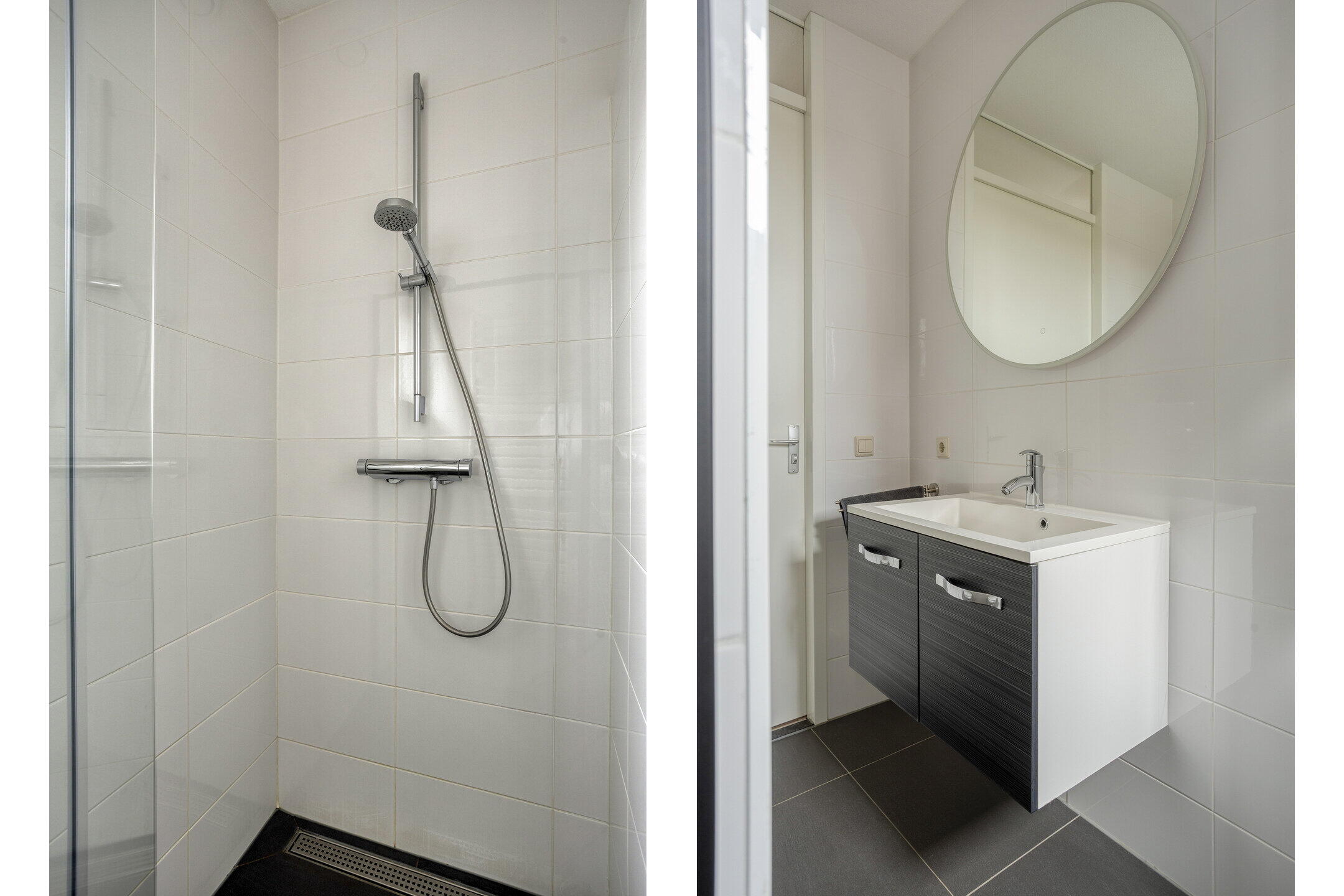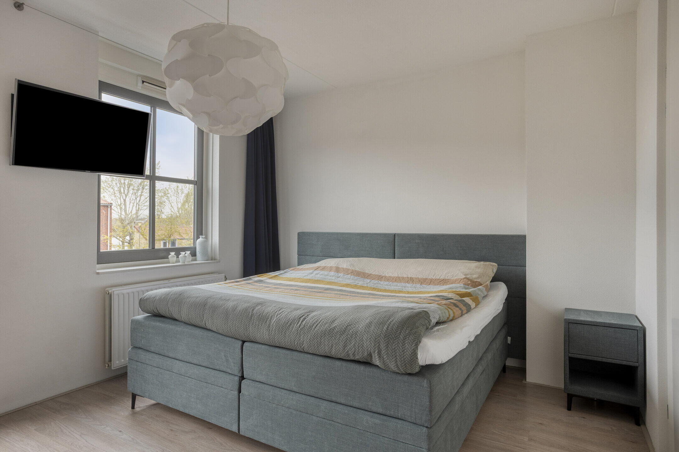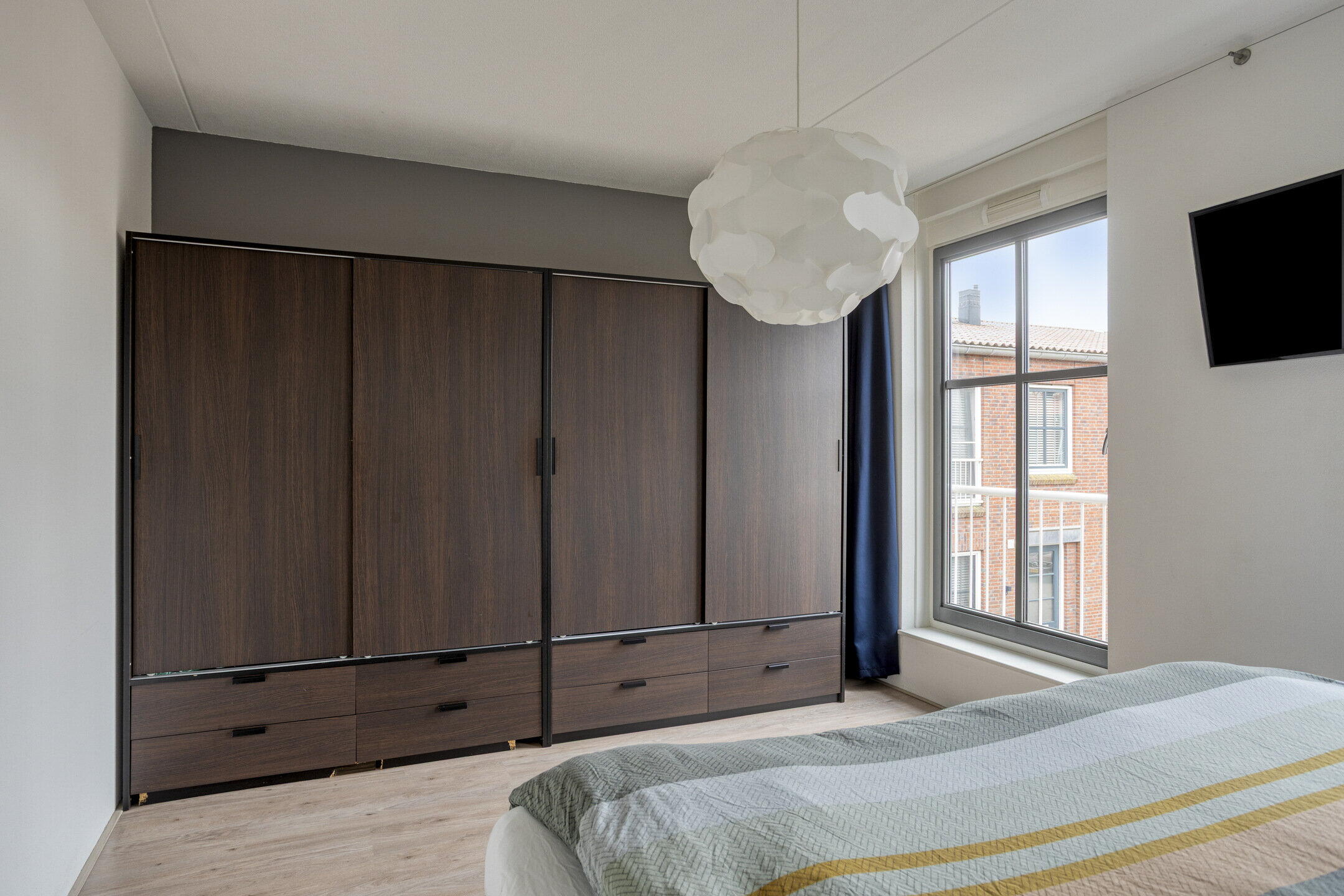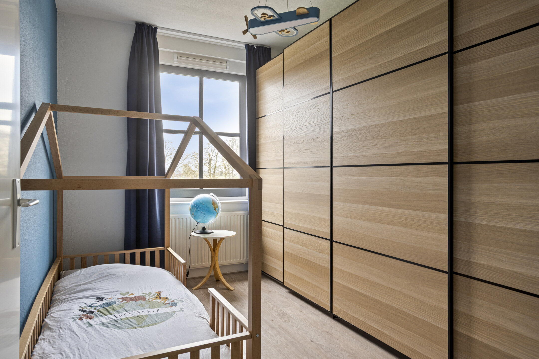 Overloop met toegang tot drie slaapkamers en een inpandige berging met witgoedaansluitingen. De riante master bedroom ligt aan de voorzijde en biedt volop ruimte voor een groot tweepersoonsbed en een royale kastenwand. Daarnaast beschikt de kamer over een charmant Frans balkon, wat zorgt voor extra licht en een aangename sfeer. Aan de achterzijde bevinden zich twee slaapkamers, ideaal als kinder-, werk- of hobbykamer. Samenvoegen behoort tot de mogelijkheden. De badkamer is netjes uitgevoerd met toilet, wastafel, douche, kolomkast en daglicht via het zijraam.
